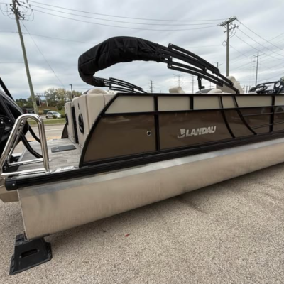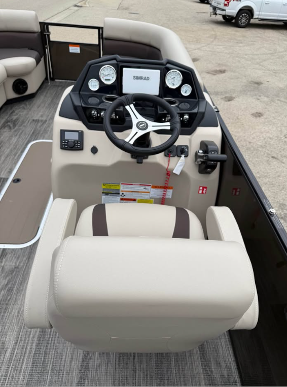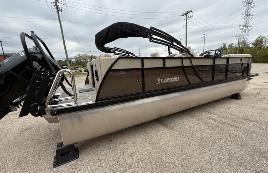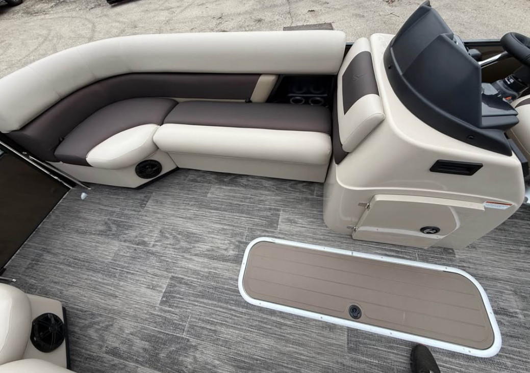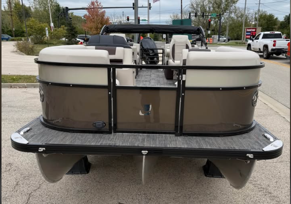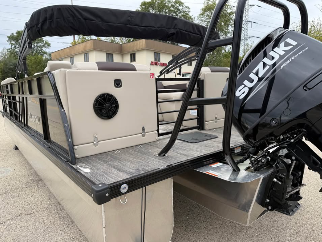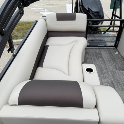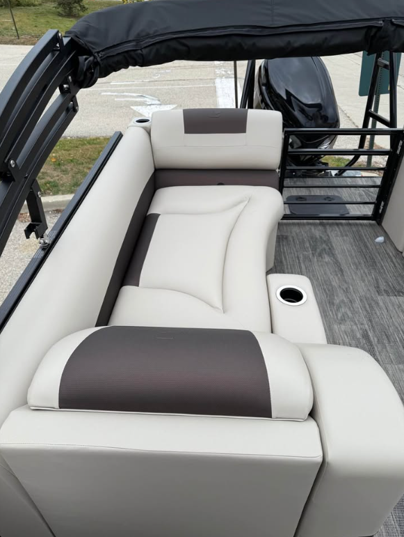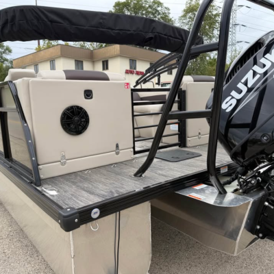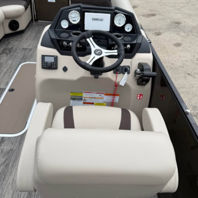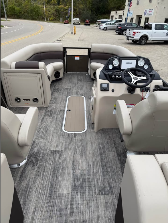 This tritoon features a simrad screen, Bluave speakers, dry ski storage with Landau’s unique double gasketed system, along with a ski tow bar for family fun.