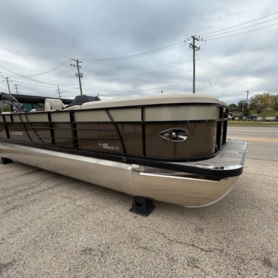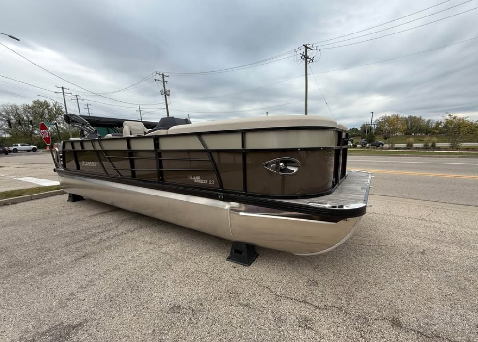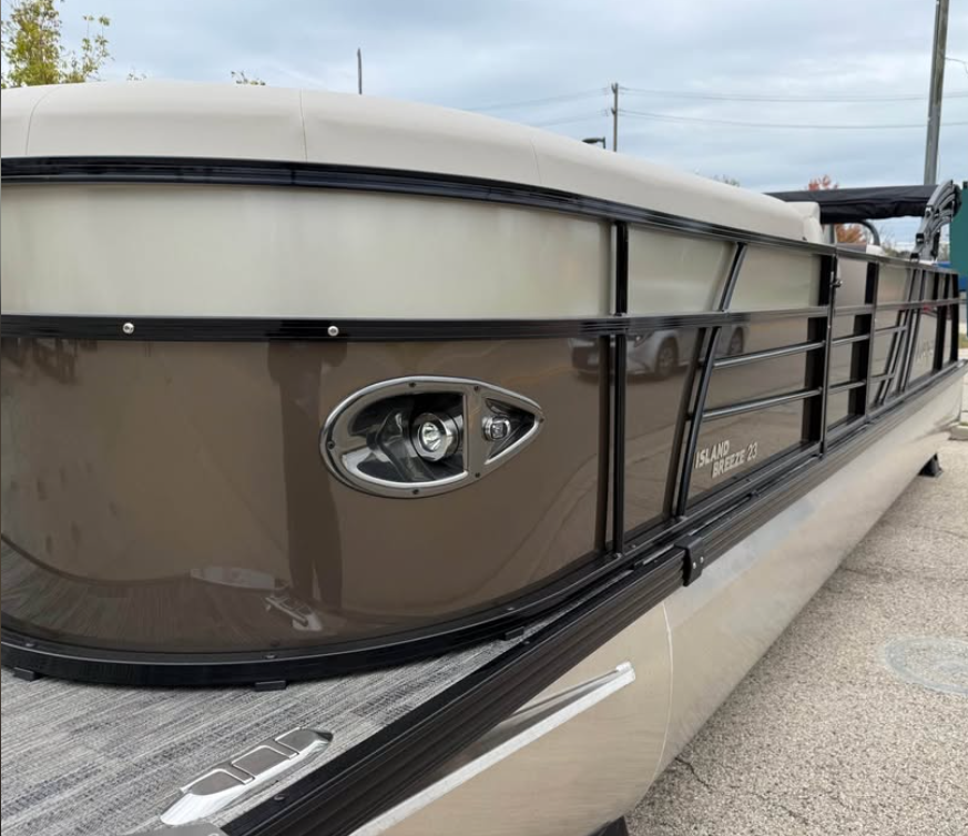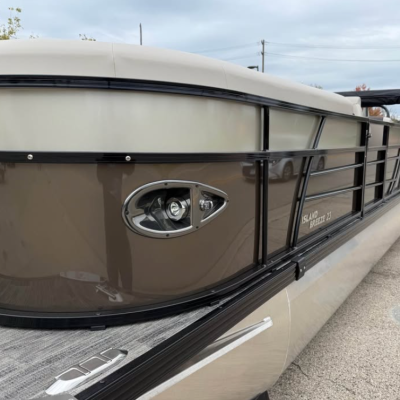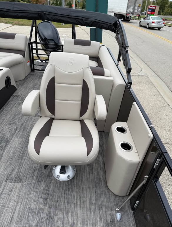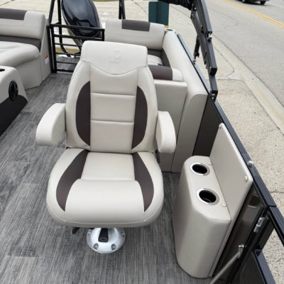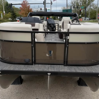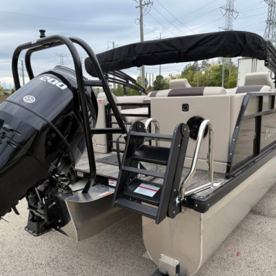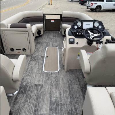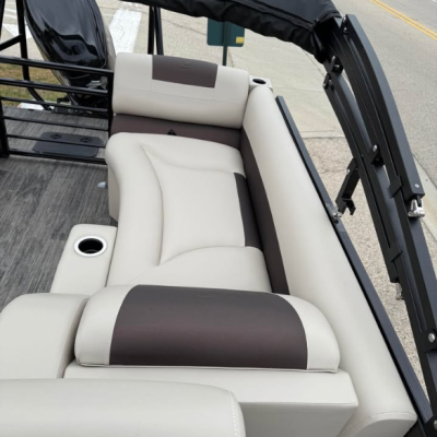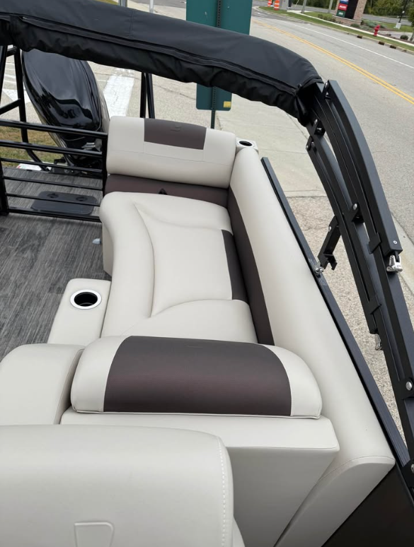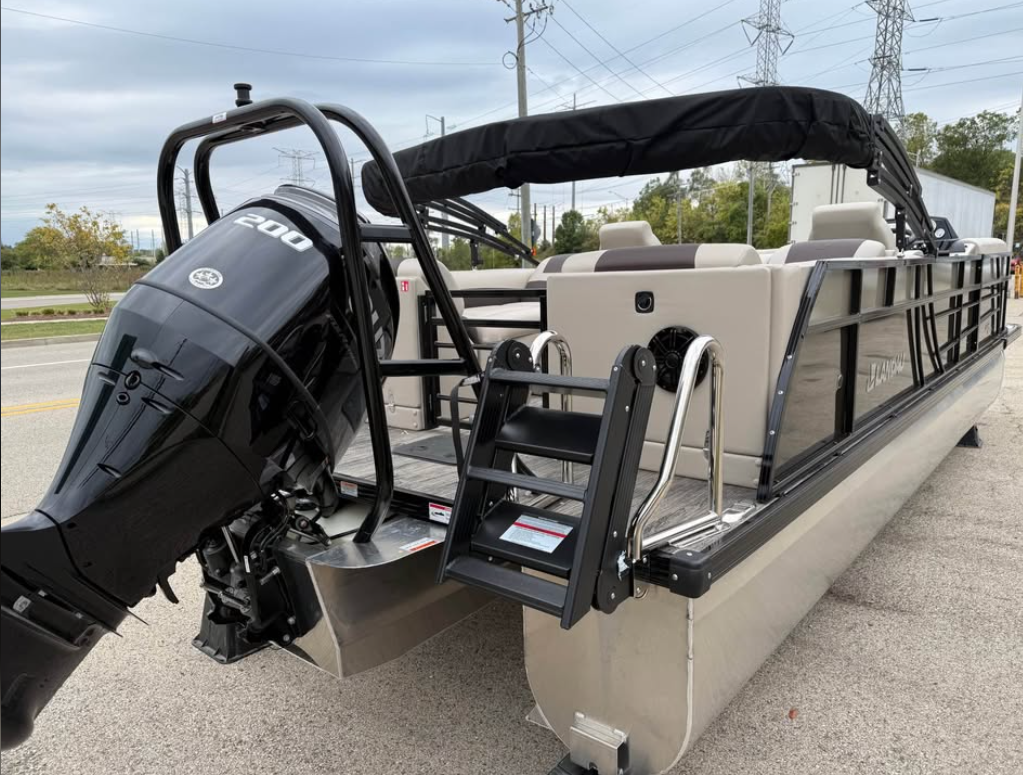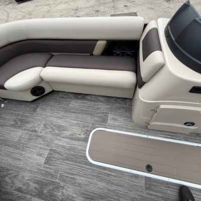 This tritoon features a simrad screen, Bluave speakers, dry ski storage with Landau’s unique double gasketed system, along with a ski tow bar for family fun.